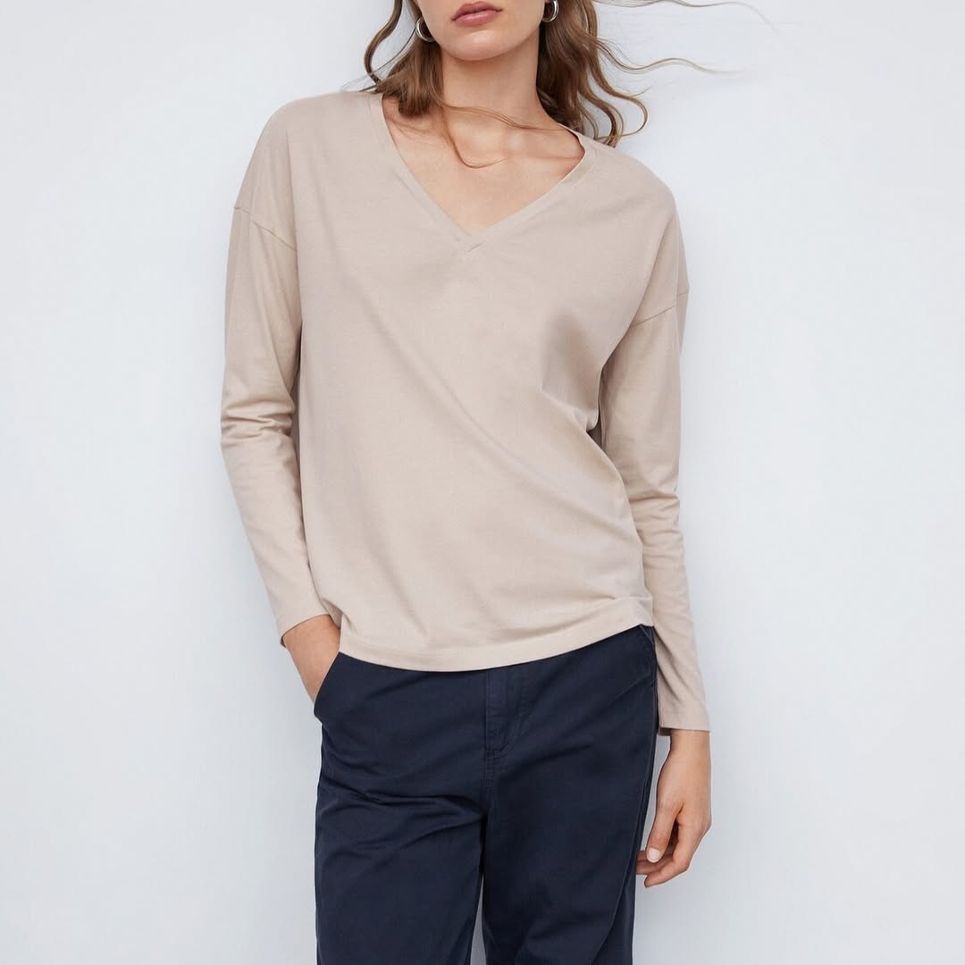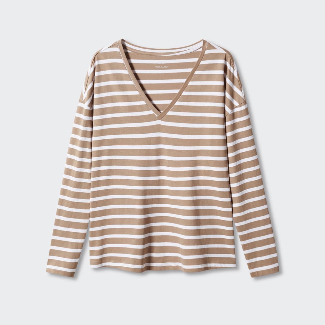 بلوز نخی راه راه و ساده وارداتی از برند منگو با رنگبندی و سایزبندی ، رنگ کرم موجود مناسب سایز ۳۶ تا ۴۰ رنگ کرم نسکافه ای راه راه مناسب سایز ۴۰ تا ۴۴